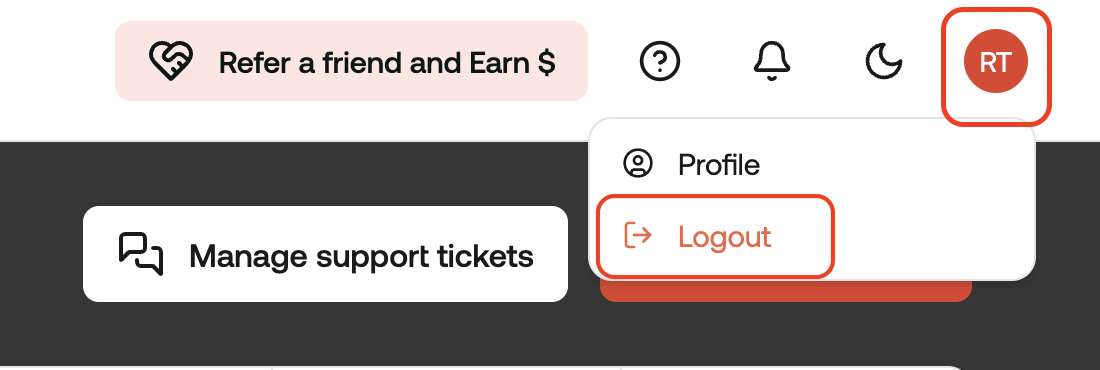 - In the Hosting Panel, click the top-right icon, and then click Logout: