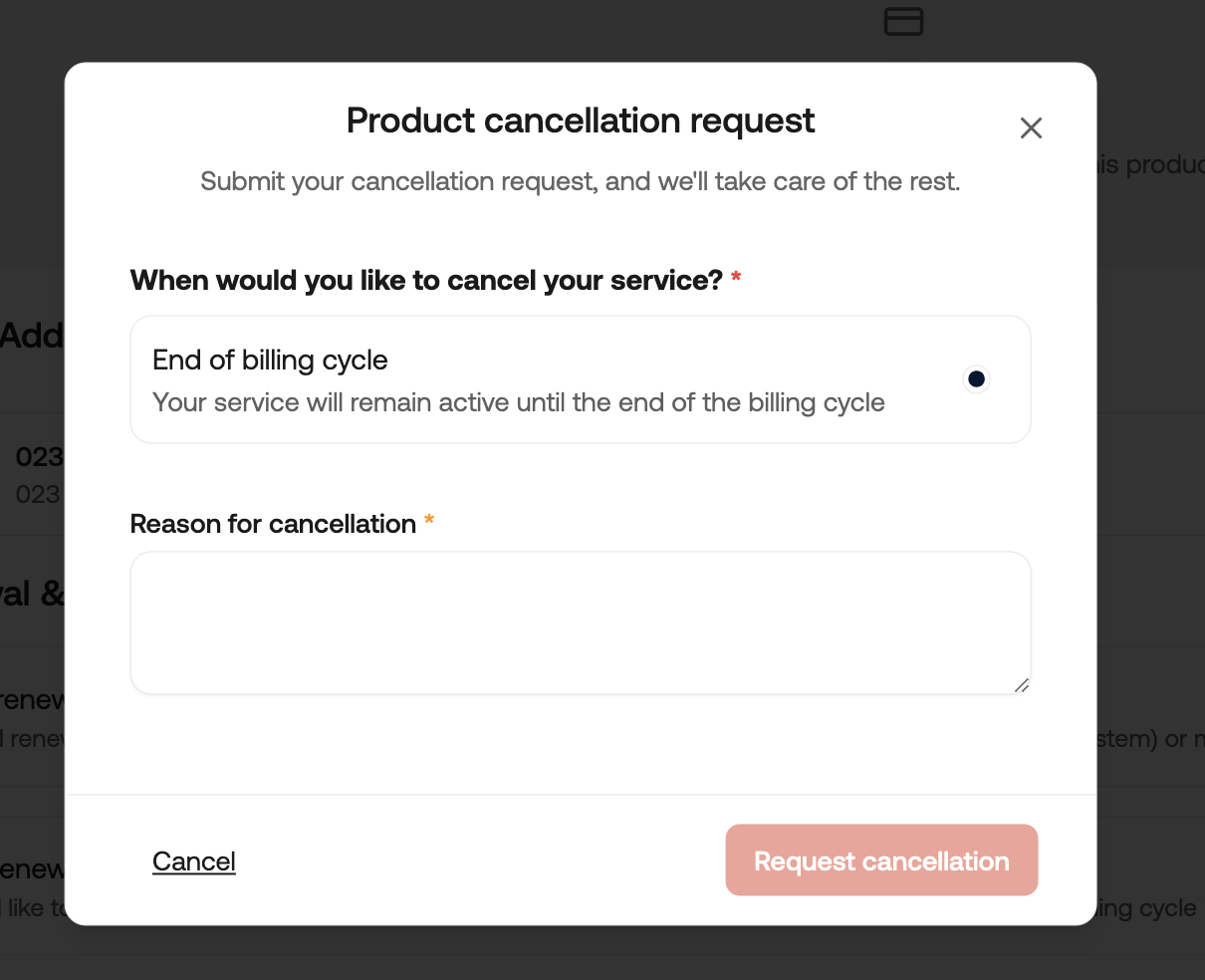 - In the Product cancellation request dialog box, please specify when you want the cancellation to take effect, and a reason for the cancellation: