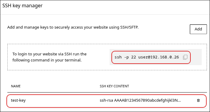 NoteYou can add multiple keys for your account. To do this, click Add, and then repeat steps 7 to 9. To delete a key, click the trash can icon, and then click Delete to confirm.