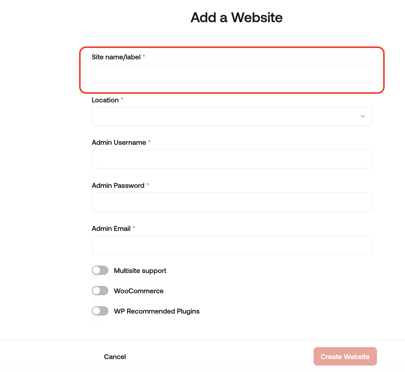On the Add a Website page, in the Site name/label text box, type your WordPress site’s name: