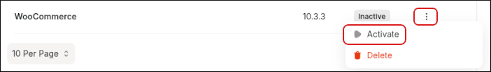 On the Installed Plugins tab appears a list of your installed plugins. Locate the WooCommerce plugin, and then in the Actions column, click the three-dot icon, and then click Activate: