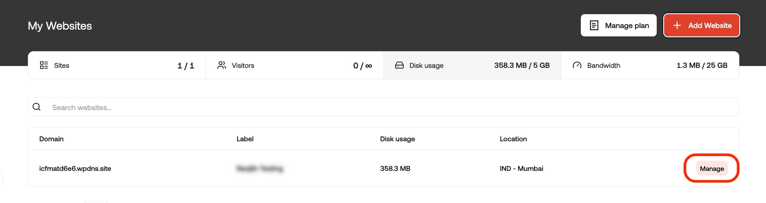 On the My Websites page, locate the site, and then click Manage: