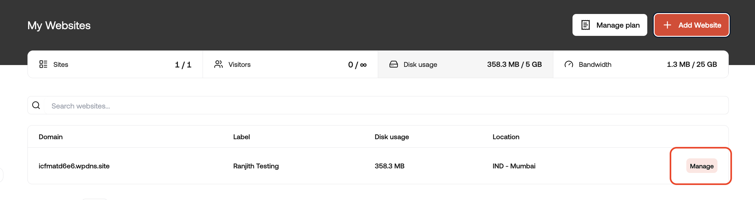 On the My Websites page, locate the site, and then click Manage: