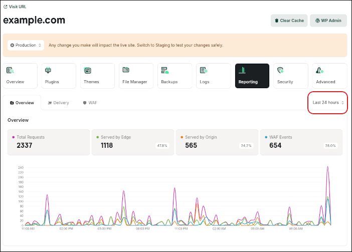 - Delivery: This section shows the number of site visits and where they were served from (Cloudflare Edge or the origin server).