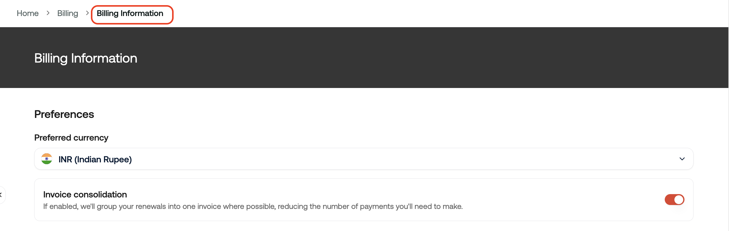 You can specify your preferred currency and invoice consolidation options. To do this, follow these steps: