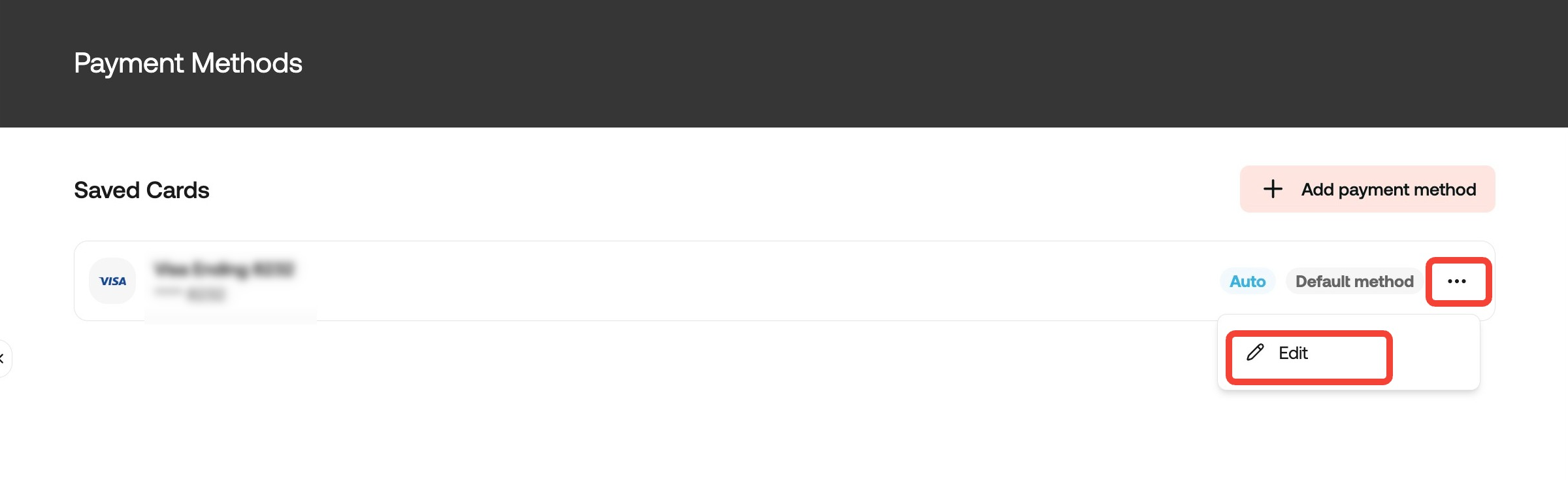 - After you add a payment method, it appears in the list of payment methods. To edit the payment method, click the three-dot menu, and then click Edit: