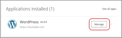 In the Applications installed section, locate your WordPress site, and then click Manage: