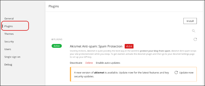 To manage your WordPress plugins, in the left sidebar, click Plugins: