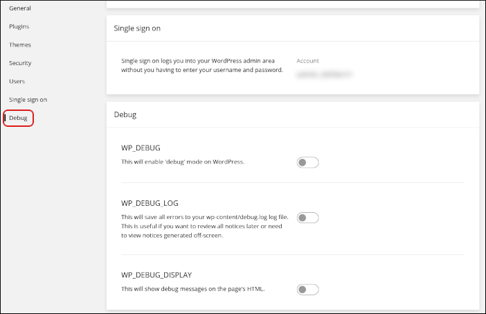 To configure WordPress debugging settings, in the left sidebar, click Debug: