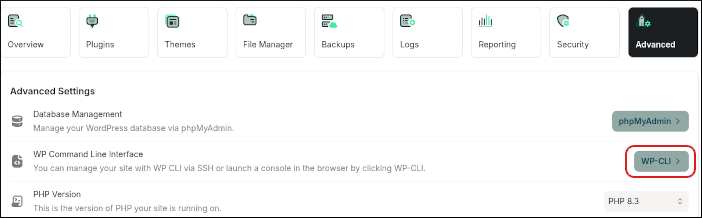 In the Advanced Settings section, in the WP Command Line Interface row, click WP-CLI: